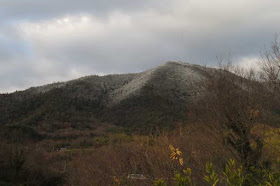 今朝,外を見ると山のいただきにうっすら白いものが。