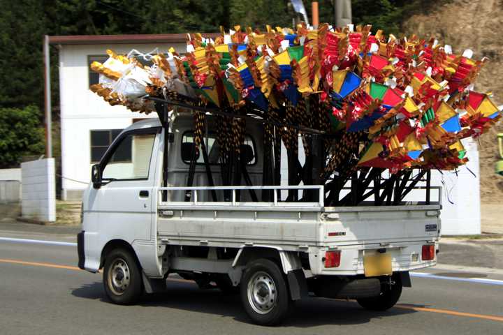 安芸門徒は旧暦の盆に盆灯篭を立てる習慣があります。最近は、トラックに山積みされたものを良く見かけます。