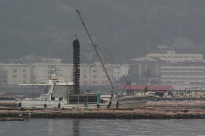 口から白い息が出る中、沖合いではカキの水揚げをしていました。