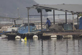 沖合いでは、カキの水揚げを行っていました。