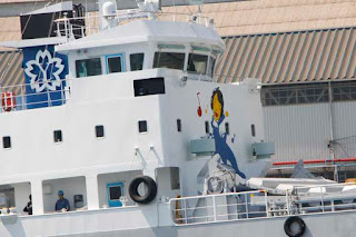 イルカに乗った少年は、船に乗り日本の海を走っています。