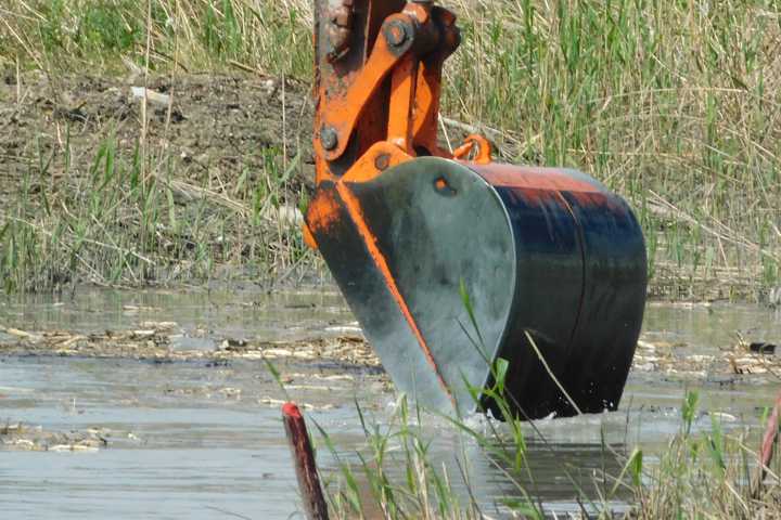 大きな泥上掘削機のバケットが、土砂を取り除いていました。