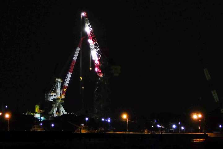 「カーン カーン カーン」。クレーンの明かりの中、造船所では作業する音が聞こえます。