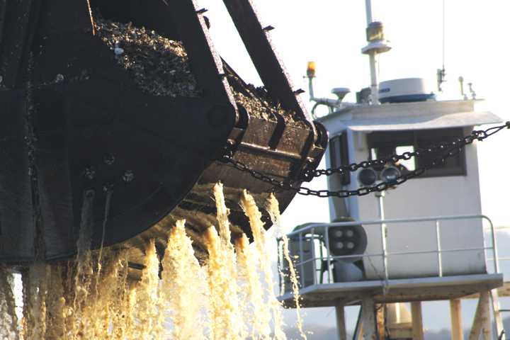 グラブバケットに満載されたカキ殻を船に積み込んでいました。